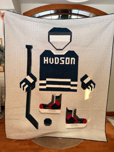 This one-of-a-kind quilt was lovingly handcrafted by one of our own hockey grandmas, making it a truly special piece of Hudson Hockey pride.